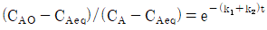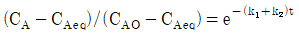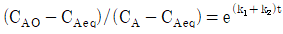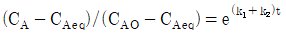 다음 반응이 회분식 반응기에서 일어날 때 반응시간이 t이고 처음에 순수한 A로 시작하는 경우, 가역 1차 반응을 옳게 나타낸 식은? (단, A와 B의 농도는 CA, CB이고, CAeq는 평형상태에서 A의 농도이다.)