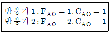 반응물 A는 1차 반응 A→R에 의해 분해된다. 사로 다른 2개의 플러그흐름반응기에 다음과 같이 반응물의 주입량을 달리하여 분해 실험을 하였다. 두 반응기로부터 동일한 전화율 80%를 얻었을 경우 두 반응기의 부피비 V2/V1은 얼마인가? (단, FA0 공급물 속도이고, CA0는 초기 농도이다.)