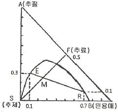 그림과 같이 50wt%의 추질을 함유한 추료(F)에 추제(S)를 가하여 교반 후 정치하였더니 추출상(E)과 주진상(R)으로 나뉘어졌다. 다음 중 틀린 것은?