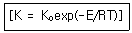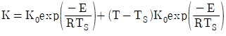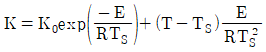 반응속도 상수는 다음의 아레니우스(Arrhenius) 시으로 표현될 수 있다. 여기서 조성 K0와 E 및 R은 상수이며 T는 온도이다. 정상상태 온도 TS에서 선형화 시킨 K의 표현으로 타당한 것은?