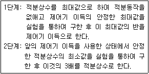 현장에서 PI제어기를 시행착오를 통하여 결정하는 방법이 아래와 같다. 이 방법을 G(s)= 1/(s+1)3 인 공정에 적용하여 1단계 수행 결과 제어기 이득이 4일 때, 페루프가 불안정해지기 시작하는 적분상수는?