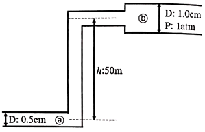 20L/min의 물이 그림과 같은 원관에 흐를 때 ⓐ지점에서 요구되는 압력(kPa)은? (단, 마찰손실은 무시하며, D는 관의 내경, P는 압력, h는 높이를 의미한다.)