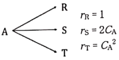 A의 분해반응이 아래와 같을 때, 등온 플러그 흐름 반응기에서 얻을 수 있는 T의 최대 농도는? (단, CA0=1이다.)