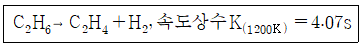다음 비가역 기초반응에 의하여 연간 2억 kg 에틸렌을 생산하는데 필요한 플러그흐름 반응기의 부피는 몇 m3 인가? (단, 압력은 8atm, 온도는 1200K 등온이며 압력강하는 무시하고 전화율 90% 를 얻고자 한다.)