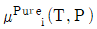 두 성분이 완전 혼합되어 하나의 이상용액을 형성할 때 i성분의 화학포텐션(μi)은 아래와 같이 표현된다. 동일 온도와 압력 하에서 I성분의 순수한 화학포텐(μpurei)의 표현으로 옳은 것은? (단, xi는 i성분의 몰분율, μ(T,P)는 해당 온도와 압력에서의 화학포텐셜을 의미한다.)