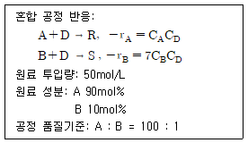 어떤 공장에서 아래와 같은 조건을 만족하는 공정을 가동한다고 할 때 첨가해야하는 D의 양(mol)은? (단, 반응은 완전히 반응한다고 가정한다.)