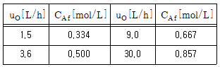 기체반응물 A(AA0= 1mol/L)를 혼합흐름 반응기(V=0.1L)에 넣어서 반응시킨다. 반응식이 2A → R이고, 실험결과가 다음 표와 같을 때, 이 반응의 속도식(-rA; mol/Lㆍh)은?