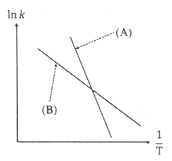 다음은 Arrhenius 법칙에 의해 도시(plot)한 활성화 에너지(Activation energy)에 대한 그래프이다. 이 그래프에 대한 설명으로 옳은 것은?