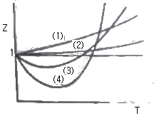 실제기체의 압축 인자 (compressibility factor)를 나타내는 그림이다. 이들 기체 중에 서 저온에서 분자간 인력이 가장 큰 기체는?