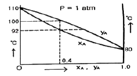 다음 그림은 A, B-2성분계 용액에 대한 1기압 하에서의 온도-농도간의 평형관계를 나타낸 것이다. A의 몰분율이 0.4 인 용액을 1기압 하에서 가열할 경우, 이 용액의 끓는 온도는 몇 ℃ 인가? (단, XA 는 액상 몰분률이고, yA는 기상 몰분률이다.)