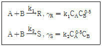 액상 반응이 다음과 같이 병렬 반응으로 진행될 때 R을 많이 얻고 S를 적게 얻으려면 A, B 의 농도는 어떻게 되어야 하는가?