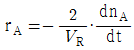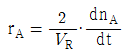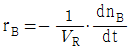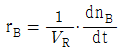 일반적인 반응 A → B 에서 생성되는 물질 기준의 반응속도 표현을 옳게 나타낸 것은? (단, n 은 몰수, VR 은 반응기의 부피이다.)