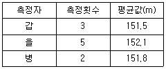 다음은 A, B 두 지점의 거리를 관측한 결과이다. 이 측정 결과를 가지고 구한 최확값은?