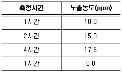 한 근로자가 하루 동안 TCE에 노출되는 것을 측정한 결과가 아래와 같을 때, 8시간 시간가중 평균치(TWA; ppm)는?