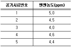 같은 작업 장소에서 동시에 5개의 공기시료를 동일한 채취조건하에서 채취하여 벤젠에 대해 아래의 도표와 같은 분석결과를 얻었다. 이 때 벤젠농도 측정의 변이계수(CV%)는?