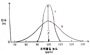 두 집단의 어떤 유해물질의 측정값이 아래 도표와 같을 때 두 집단의 표준편차의 크기 비교에 대한 설명 중 옳은 것은?