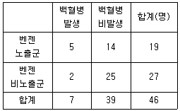 다음 표는 A작업장의 백혈병과 벤젠에 대한 코호트 연구를 수행한 결과이다. 이 때 벤젠의 백혈병에 대한 상대위험비는 약 얼마인가?
