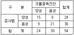 다음 표와 같은 크롬중독을 스크린하는 검사법을 개발하였다면 이 검사법의 특이도는 얼마인가?