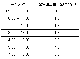 절삭작업을 하는 작업장의 오일미스트 농도 측정결과가 아래표와 같다면 오일미스트의 TWA는 얼마인가?(오류 신고가 접수된 문제입니다. 반드시 정답과 해설을 확인하시기 바랍니다.)