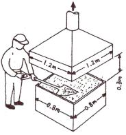 그림과 같은 작업에서 상방흡인형의 외부식후드의 설치를 계획하였을 때 필요한 송풍량은 약 m3/min인가? (단, 기온에 따른 상승기류는 무시함, P=2(L+W), Vc=1m/s)