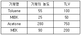 금속도장 작업장의 공기 중에 혼합된 기체의 농도와 TLV가 다음 표와 같을 때, 이 작업장의 노출지수(EI)는 얼마인가?(단, 상가 작용 기준이며 농도 및 TLV의 단위는 ppm이다.)