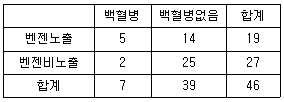 다음 표는 A작업장의 백혈병과 벤젠에 대한 코호트 연구를 수행한 결과이다. 이 때 벤젠의 백혈병에 대한 상대위험비는 약 얼마인가?