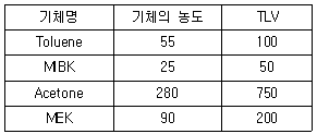 금속 도장 작업장의 공기 중에 혼합된 기체의 농도와 TLV가 다음 표와 같을 때, 이 작업장의 노출지수(EI)는 얼마인가? (단, 상가 작용 기준이며 농도 및 TLV의 단위는 ppm이다.)