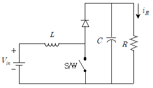 그림과 같은 컨버터에서 입력전압 Vin은 200[V], 스위치(S/W)의 듀티비는 0.5, 부하저항 R은 10[Ω]이다. 이 컨버터의 부하저항 R에 흐르는 전류 iR의 평균치[A]는? (단, 커패시턴스 C와 인덕턴스 L은 충분히 크다고 가정한다)