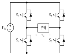 그림과 같은 단상 풀브리지 인버터에서 발생하지 않아야 하는 스위칭상태는?