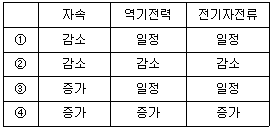 정격속도로 무부하 운전 중인 손실이 없는 타여자 직류전동기의 속도를 증가시켰을 때, 자속, 역기전력 및 전기자전류의 변화로 옳은 것은? (단, 공급전압과 전기자저항은 일정하고, 속도는 정상상태로 가정한다)