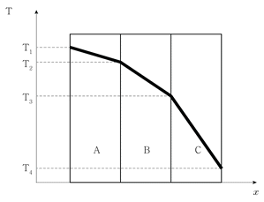 그림은 서로 다른 세 가지 물질 A, B, C로 구성된 다중의 평면벽이다. 벽의 두께(x) 방향으로의 정상상태 열전도만을 고려할 때, 열전도도(thermal conductivity)가 가장 큰 물질은? (단, 물질의 두께는 서로 같고, T는 온도를 나타낸다)