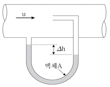 그림과 같이 직경이 일정하고 마찰이 없는 매끈한 수평관에 밀도가 1.2kgㆍm-3인 비압축성 기체가 유속(u) 13mㆍs-1로 흐를 때, 압력계의 높이차(△h)[cm]는? (단, 점성 영향을 무시할 수 있는 정상상태 흐름이고, 액체 A의 밀도는 1,015.2kgㆍm-3이며, 중력가속도는 10mㆍs-2이다)