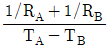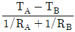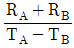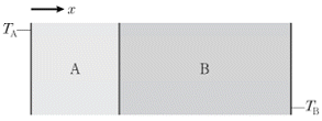 창고의 단열을 위해 A층과 B층으로 이루어진 이중벽을 만들었다. A층과 B층의 열전달 저항[K⋅W-1]은 각각 RA, RB이고, 벽 내부와 외부의 온도[K]는 각각 TA, TB이며, 열은 정상상태로 x축 방향으로만 전달된다. 벽을 통한 열전달 속도[W]는? (단, TA>TB)