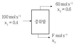 정상상태에서 헥세인과 옥테인의 혼합물이 100mols-1의 유속으로 증류탑으로 유입되어 기체 흐름으로 60mols-1, 액체 흐름으로 Fmols-1의 유속으로 유출된다. 유입흐름에서 헥세인의 몰분율(x1)은 0.4, 기체 흐름에서 헥세인의 몰분율(x2)은 0.6이다. 증류탑으로 유입되는 옥테인 중 액체 흐름에서 회수되는 옥테인의 몰분율[%]은? (단, 반응은 일어나지 않고, x3는 액체 흐름에서 헥세인의 몰분율이다)