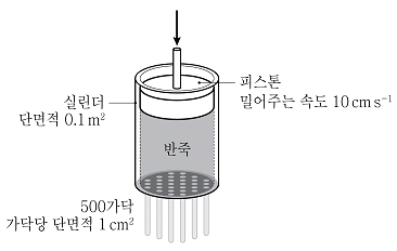 압출 방향에 대해 수직으로 자른 실린더 내부 단면적이 0.1m2인 압출 장비로 국수를 뽑고 있다. 피스톤이 10cms-1의 속도로 반죽을 밀어 단면적이 1cm2인 국수가 500 가닥 압출되고 있다면, 국수의 압출 속도[cms-1]는? (단, 실린더 내부는 국수 반죽으로 가득 차 있고 공극은 없으며 국수 반죽은 밀도가 일정한 비압축성 유체이고 국수 압출 시 실린더 내에서 동일한 압력을 받는다)
