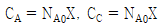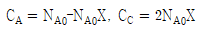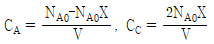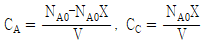 등온 회분식반응기에서 A+B→2C+D 반응이 양론비로 진행될 때, A와 C의 농도(CA, CC)를 나타내는 식으로 옳은 것은? (단, 반응기 부피는 V로 일정하고, 반응물 A의 전환율은 X이며, 반응 초기에는 A와 B만 존재하고, 이때 A의 몰 수는 NA0이다)