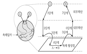 그림에 나타난 불균일계 촉매반응(A→B)의 각 단계에 대한 설명으로 옳지 않은 것은? (단, A는 반응물이고, B는 생성물이다)