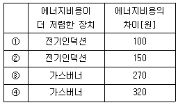 동일한 열량을 공급하는 전기인덕션과 가스버너를 각각 1시간 동안 사용하였다. 전기인덕션의 소비전력이 2kW이고, 효율이 90%이며, 가스버너의 효율이 30%일 때, 두 장치 중 에너지비용이 더 저렴한 장치와 두 장치 간 에너지비용의 차이[원]를 바르게 연결한 것은? (단, 전기요금과 도시가스요금은 kWh당 각각 250원, 100원이다)