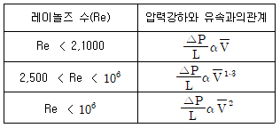 어떤 비압축성 액체가 단면적이 일정한 수평 원관을 흐를 때, 레이놀즈(Reynolds) 수에 따른 유체의 압력강하△P/L()와 유속(