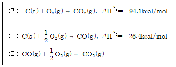 반응 (가)와 (나)의 표준생성열(standard heat of formation)이 다음과 같을 때, 반응 (다)의 표준반응열(standard heat of reaction)[kcal/mol]은?