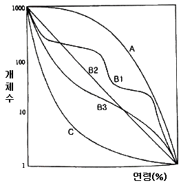 다음 연령곡선 그래프에서 인간의 생존곡선과 가장 가까운 것은?