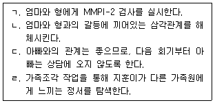 최근 사회적 거리두기로 가족과 함께 있는 시간이 많아지면서 작은 아들 지훈(초4)이가 더욱 의기소침해지고 죽고 싶다는 이야기를 자주하는 문제로 가족이 상담을 받으러 왔다. 아빠는 지훈이와 사이가 좋으나 집에 없을 때가 많으며, 자녀에 대한 통제가 심한 엄마도 맞벌이로 바쁘고, 활달하고 고집이 센 형(고1)은 성적과 학습태도 문제로 엄마와 자주 싸운다. 이 사례에 대한 가족상담 개입으로 옳은 것을 모두 고른 것은?