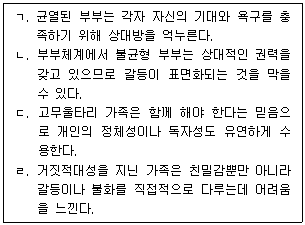 61 최근 사회적 거리두기로 가족과 함께 있는 시간이 많아지면서 작은 아들 지훈(초4)이가 더욱 의기소침해지고 죽고 싶다는 이야기를 자주하는 문제로 가족이 상담을 받으러 왔다. 아빠는 지훈이와 사이가 좋으나 집에 없을 때가 많으며, 자녀에 대한 통제가 심한 엄마도 맞벌이로 바쁘고, 활달하고 고집이 센 형(고1)은 성적과 학습태도 문제로 엄마와 자주 싸운다. 이 사례에 대한 가족상담 개입으로 옳은 것을 모두 고른 것은? 62 다음에서 상담자가 시도하고 있는 개입 기법은? 63 청소년기 자녀가 있는 가족에 대한 상담개입으로 옳은 것은? 64 다음에 해당하는 가족상담 윤리원칙은? 65 가족상담 모델과 주요 기법의 연결로 옳은 것을 모두 고른 것은? 66 후기 가족상담의 이론적 기초에 관한 설명으로 옳지 않은 것은? 67 카터(B. Carter)와 맥골드릭(M. McGoldrick)이 제시한 재혼가족 생활주기 상의 발달과제를 순서대로 옳게 나열한 것은? 68 구조적 가족상담자가 관심을 두어야 하는 영역으로 옳은 것을 모두 고른 것은? 69 수정(여, 중3)은 온라인게임에 빠져 학교생활도 불성실하고 가족들과도 극심한 갈등상황에 처해있다는 이유로 상담을 받게 되었다. 수정과의 첫 회기에서 상담자가 가장 먼저 해야 할 일은? 70 장기간 단기치료(long-term brief therapy)라 불리며, 2개의 남녀 혼성조 중 1조는 상담하고 2조는 관찰하는 방식으로 진행되는 모델에서 주로 활용하는 상담기법은? 71 해결중심 단기상담의 발달과정에 관한 설명으로 옳은 것을 모두 고른 것은? 72 해결중심 단기상담의 치료 원리에 해당하지 않는 것은?