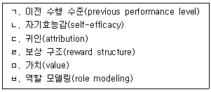 다음은 로크와 라뎀(Locke & Latham)이 제시한 학습목표 설정에 대한 학습자의 헌신(commitment)에 영향을 주는 요인들이다. 개인적 요인에 해당하는 것을 모두 고른 것은?