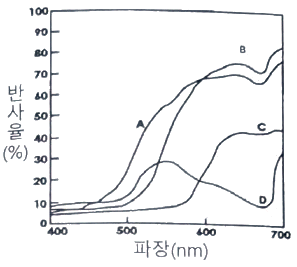다음 곡선 중에서 양배추의 분광반사율을 나타내는 것은?
