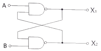그림의 회로에서 A=B=0이면 X1과 X2의 값은 각각 얼마인가?