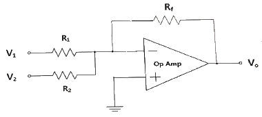 다음 연산증폭기에서 R1=R2=100[kΩ], Rf=25[kΩ]이고, V1=2[V], V2=4[V]일 때 출력전압 V0는?