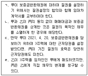 甲은 2021. 3. 6. 乙로부터 X주택을 보증금 10억 원에 임차하였고, 2021. 3. 13. 丙으로부터 6억 원을 대출받으면서 보증금반환채권 중 8억 원에 대하여 질권을 설정해 주었으며, 乙은 이를 승낙하였다. 乙은 2022. 6. 30. 甲에게 X주택을 15억원에 매도하면서, 甲으로부터 보증금을 제외한 잔액을 지급받고서 소유권이전등기절차를 마쳐주었다. 이에 관한 설명으로 옳은 것을 모두 고른 것은? (다툼이 있으면 판례에 따름)
