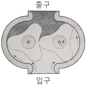 다음 그림과 같이 회전자가 연속적으로 접촉하여 회전하며 1회전 당 토출량은 많으나 토출량의 변동이 큰 특징을 가진 펌프는?
