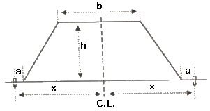 그림과 같이 지표면에서 성토하여 도로폭 b=6m 의 도로면을 단면으로 개설하고자 한다. 성토높이 h=5.0m, 성토기울기를 1 : 1로 한다면 용지폭(2x)은? (단, a : 여유폭 = 1m)